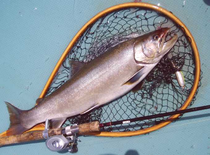 2008年4月21日、祝:銀山湖解禁!! ・・・なのだが、、、 『思いっキリ、的を外しちゃいマシタ。』 (^^ゞ 水温計を見ながら場所を移動するも、いまひとつワカサギの姿が見えない日。。。 出だしが悪い日は期待もできず、どうにもこうにも案の定、 たぶん我ら4人の2艇は、偶然にも時同じくして場所の選択をミスったのだと。 いやいや、この日は魚が居ない日だったのだと!! 釣れず釣れずに、いよいよ半ベソかきながらの必殺≪泣いてでも釣るゾ釣法≫にて2匹。 悔しくも40に届かないイワナとレインボーのみでした。 オレの見当誤りにて、同船者にも苦汁を舐めさせてしまった事を御詫びします。 ↓やっと釣った唯一のイワナの図 初心に帰り、スプーンでカウントダウンの効果でした。 しかし、このネットがあまりにもデカスギ!! 5月3日、すでに釣れない日々をおくっておりました。 表水温は8℃〜13℃と、ワカサギも湧きマクリでした。 思う様に釣れない、ガンとして釣れない、泣いても釣れない。 どうしたのだ今年の銀山は??? 嬉しい事に、トローリング勢も釣れなくて泣いちゃってますが。 でもこの日、溜まり貯まった内部ストックが放出し、数年振りに奇蹟が起きる。 朝からパッとせず、ボウズで帰るのかと半ベソかきの、 同行者に気の利いた言い訳を考えつつも、水が動いた気配を感じた昼過ぎ、 ↓3年待った、やっと出た、大イワナ57pの図(おしぃ) キャスティングです、REVO君です、スミス8ft改です、Dコン85です。 あの巨大なネットオーバーなのです!! 居ると直感した時点で8割方は釣った気になる野良屋さんなのです。 妄想と現実を結び付けるのは蚊細いラインのみ。 「釣れて欲しいな〜、」ではなく、『釣る!』の信念のみが状況をも曲げさせるのです。 ラインがその重さを感じた時点で、既に頭の中は祝勝会が始まってました。 掛けたが最後、バラシませ〜ん。 そのグリップから満月になったロッドを抱きつつも、余裕でジョークすらも飛ばせます。 もちろんリリースです。また釣りたいと願いを込め、40でも50でも58でもリリースして来た結果、女神様は再度微笑んでくれるのだと信じています。 60でも70にでもなってまた掛かって来なさい。 もしもイワナ70であろうとサクラ80であろうと、女神様を微笑ませる為にもリリースなのだョ諸君!! その後はやはりパッとせず、女神様も微笑まず、この年の銀山湖は沈黙し続けました。 この年に釣った数は、悲しいかな数えられる程度でありました。 結論:『昨年が当たりすぎたのかと、、、』 〜以上、2008年度の銀山湖の見せられるのみの報告でゴザイマシタ。(^^ゞ |