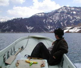 『おっ、イワナですョ!』 船べりに寄せてネットに納める。