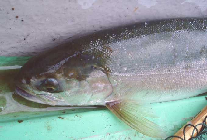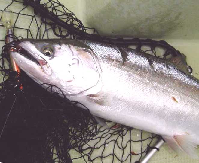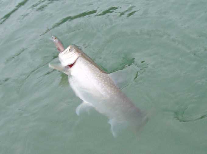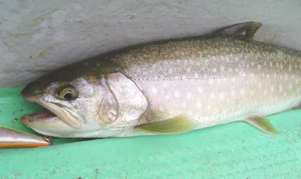 | 2007年4月21日、待望の銀山湖解禁は珍しく湧きに沸いた日となった。 この前日数日間は雪代が入ってなくて安定していたのか、北之岐でも比較的水温が高く、ワカサギの群も十分に居て期待が高まった。出船して早々に追いもあり、同行者が先陣切っての初ヒット! 『今日はイケル♪』 活性の高い解禁日、この状況を逃してはならない。 表層でワカサギを追いまわしているのは主に鉄砲玉的な30クラスの固体が多い。この状況下で水面でも活性が高いからこそ、も少し深場を狙って大物を一発当てるチャンスでもある。 岸と平行線で沖合い5m、ボトムなのだ、表層には目もくれずに底を取る。 活性は高い、居る、食う、食わせる。釣りは偶然ではなく、信念と状況が合致した時に必然と釣れる。 もしも確率論的な要素があるならば、その確率を高めるのがテクであり、ソレは決して神頼みや魚に念を送るワケでもなく、確率が高い所を見極めて確率の高い探り方をする。食うのは偶然かも知れないが、食わせる状況に自分の身を入れるのが必然的要素となってヒットを生み出す。 信念通りに深場から引き出した初物イワナは44p。 釣れればイイではなく、イワナを釣る、狙いはイワナのポイントと釣り方での結果である。 この水中にはイワナもサクラもレインボーもワカサギを狙ってウロウロしているであろう。がしかし、イワナのみにターゲットを絞った釣り方も可能なのだ。 さて、あなたはこの湖に暮らす悠々たる銀山湖の大イワナである。水温も好ましく、エサのワカサギも食べ切れない程に湧いている嬉しい日々。岸辺の浅場にはワカサギがビビッて群れて固まってるゾ。でも今あなたはどこに居る? 表層で雪景色でも眺めているか? 中層を泳いで体力作りでもしているか? 沖合いの湖底で静かに寝ているか? 30ソコソコのヤング君達は活発に岸辺に行ってワカサギを追いまわしているが、そのヤング君達を威圧しながらワカサギを独り占めしたくないか? 嫌でしょ、あの付近は恐いのだ。明るい鏡の様な水面が恐く、逃げ場の無い浅場はもっと恐い。沖合いの中層に居てもワカサギは捉え難いし、周りに何もない場所は目が回るし不安で恐い。居心地の良い場所は、湖水以外の何かが有って見えて隠れられてワカサギが通りかかってくれる場所。岸辺に近いカケアガリの湖底。岩もあるし木も沈んでいる。湖底と言う障害物が見える位置が一番の安心感なのだ。このカケアガリに身を潜めていれば、きっとワカサギの群が頭上を通り過ぎる。無理に危険を冒してまで浅場に食いに行くまでもなく、この安心出来る場所で捕食していても十分に旬のワカサギを堪能出来る。 ここで確率論的な要素が出て来ます。確かにイワナは表層にも居る事もあるし、沖合いの中層にも居るかも知れない。でもイワナはイワナであり、その個体が大きくなればなるほどに深場のボトム、または安全な障害物としてのカケアガリのベタ底に居るであろうと安易に想像が付く。大袈裟に言えば、沖目の表層を探ってイワナを狙うのと、根掛かり覚悟でカケアガリをトレースするのと、ドチラがイワナを釣るのに効果的であるかなのだ。川でも湖でも同じ、イワナは石を釣れであり、イワナは底を釣れと必然的になって来ます。周りに何も無い水中よりも、カケアガリや立ち木と言った障害物がある所が最も確率を高められるポイントになります。 今回活躍させたのはDコン85。シーズン初期だけに目立ったが勝ちカラーをチョイス。 純正の小さなトリプルフックは外し、大きなシングルをケブラーで結んでサイレント仕様。 このルアーはティールのフックをシングルにしただけでも動きがキビキビとし、大きなフックで掛かりも深くなるので効果的。 シングルはバレ易いって? そんな言い訳みたいな迷信を免罪符にしてる方は上達はしないでしょう。 バレるか否かは事後の話しで時の運だとでも言いたい。優先すべきはルアーを食わせる事であり、まずはルアーにガブリ付いてもらわない事には釣りにならないのだ。まぁ百歩譲ってシングルではトリプルよりもバレ易いとしよう。がしかし、その動き的には経験上でトリプルよりもアピール度が強く、同じルアーならばスローでも動いてくれるのは事実。もちろん根掛かりも回避し易いし、ルアーを舐めた程度のアタックならば痛みを与える事も少ないので、すぐさま追い食いも可能。釣りはバレる言い訳を考えながらではないのだ。まずは食わせる事、最優先すべきは食わせる確率を高める事でもある。仮に3匹掛けて3匹キャッチするのと、5匹掛けて4匹キャッチするのと、結果的にはどちらが多く釣ったと言えるか?。 でもシングルって、思う程にバレは少ないものなのですよ、と。 バレるのはコンピューターのシュミレーションでもなく事後の事実であり、全く同じ状況下でトリプルの時と比べるのは事実上不可能。見た目でもトリプルよりも動きが良いのは事実だし、曳き方によって動きを悪くす