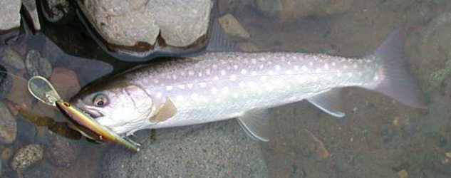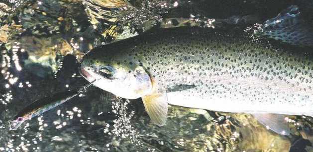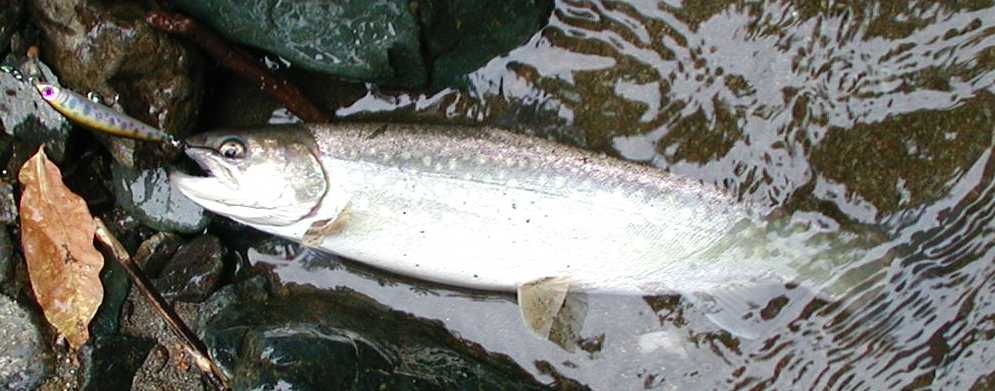 下流に下って毎度の支流との合流ポイント。水量は落ち着きつつも、多目な流れはクリアーな流れに戻っていた。 ワンキャスト目から流れの合わせ目で、小型ながらも元気溢れマクリのニジがヒット! 徐々に釣り下ると、瀬からは反応が無く、全てはプールからヒットして来る。 一撃でルアーを外すヤツ、ヒットした瞬間に身振るいしながら空に舞い上がり、バーブレスのシングルフックを吹き飛ばしてくれる。 『オレはコレが見たくてココまで来たのダァァァッ♪』 行き着く所まで釣り下り、多くを掛けてはバラシフェチの鼓動は更に勢いを増す。(笑) スバラシきかなレインボートラウト、この胸の高鳴りを聞け! 次のポイントに車を走らせ、ときめきマクル気持ちを煽るかの如くに気合を入れる。 ココでも釣りマクリの跳びマクリで大歓声を挙げる事が出来た。 まだまだストックしているポイントは続く。。。 いいのか?明朝はフェリー、まだ御土産も買いに行ってナイゾ! イイのダ、帰るのは明日の朝、今日はいつもの自由時間、常に今が全てであり、今この時間を悔いなく楽しもうではないか♪ 車に乗り込むと飲みかけのビールで一息入れ、間もなく次のポイントへ。さぁ行ってくれ!! 対岸で着水と同時に掛けた大物は、見事なるティールウォークと引き換えにルアーを吹き飛ばしてくれた。 『ツァ〜ッ、飛んだ!!! 今のを観たか!?♪』 オレの投げたルアーを咥えたヤツの華麗なる一瞬の二度とは御目にかかれない姿を! この道内のレインボートラウト、小型ながら見事にジャンプして空中でフックを外す様は、何よりも替え難い魅力を秘めている。 釣り人は魚に何を求めるのか? 大きさなのか数なのか、それとも美味しさなのか? 偶然性に頼る長さなどを自慢してるヤツはアホだ。プロもアマも同じ土俵で語り合えるのならば、決して魚を自慢するではナク、その魚を釣った自分の喜びを自慢したい。 例え大物を足元でバラシても、その出来事は熱く深く胸に刻まれる事であろう。 魚にデジタリックなタグを付けて金庫に仕舞うよりも、その時のアナロギックな感動を一晩中でも語り明かそうではないか♪