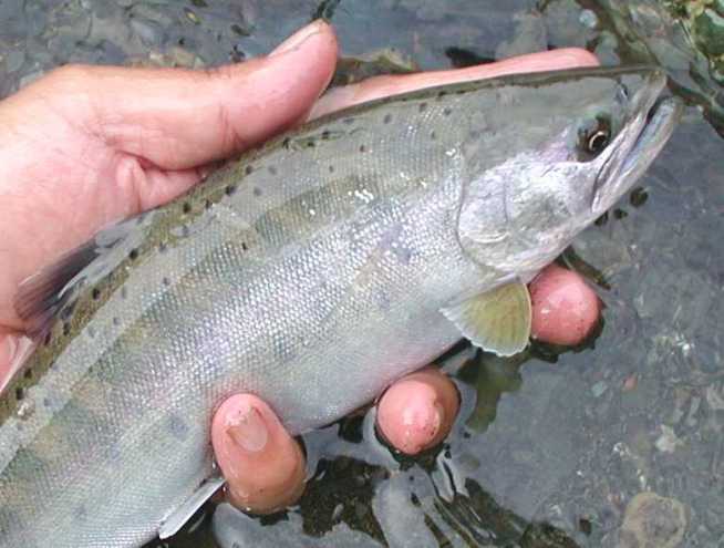 更に移動して鵡川上流部、まだ入った事がない地域だ。 牧場脇から広くもない小川に入ると、まだ大雨の名残りなのか水量は豊かにして、澄んだ流れは木々の生い茂る原野へと吸い込まれている。 ちょっとした流れの淀みにルアーを振り込む。 ゆるゆるとルアーを引いて来ると重く嬉しいアタリがあった。アメです♪ こんなにも小さな川なのに、至る所からアメマスの吐息が聞こえて来る。 水温は11℃、気を良くして道路脇のプールに移動する。 巻き返しにルアーをキャスト、まるで待ち構えて居たようにニジがヒットし、間髪入れずに宙に舞い出る! 『うっひょ〜っ♪』
