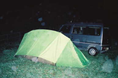 キャンプ場をやめて、トンネル脇の空き地でキャンプ。ここは国定公園なので、キャンプ場以外でのキャンプは禁止。でも、山が「いいよ」って言ってくれたので、ここにテントを張る。