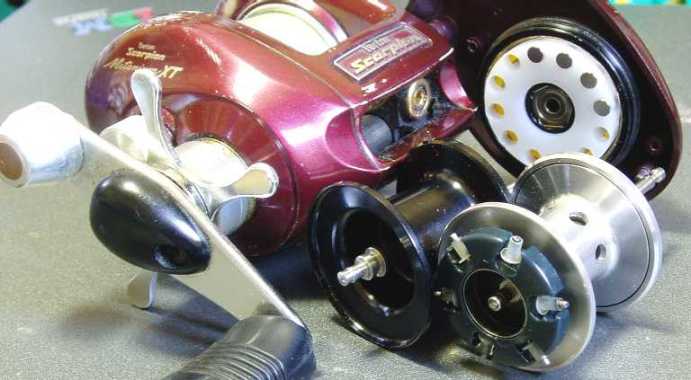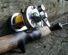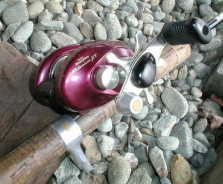 ベイトロッド *スミス TOROUTIN’CAST GC100TR10’ ☆ロングロッドの有効性とは?☆ ダブルのベイトロッド。魚野川でも平気で使用のvs大物用。 この長さを活かし、特に大川では重宝しています。 ロングロッドの際たるものは、そのパワーでの飛距離と、ルアーの操作性。 確かにルアーにアクションを加えるのならば短い方が有利なのだが、自分的には重めなスプーンとかディープミノーを多用し、ルアーを目指すポイントに正確に送り込むべく、なるべくならばラインが水中に浸かっている長さを短くと考えます。 ラインが流れに押されている時には、ルアーに対する釣り人の意図が半減しているのです。これは自分が餌釣をしていた頃からの教訓でして、ピンスポットへの攻略ならば、きっとロッドを立てて操作した方が上手く確実にポイントをトレースさせられます。目指すポイントにルアーを流し、縦のアクション、ロッドを送り込んでのドリフト、流れに逆らう事なくルアーを操作する事も可能なのです。 だからこそロングロッド!! 岸から離れて釣る事も可能ですし、足元のテトラやボサをエスケープし、流芯で定位させる攻略も可能。教科書みたいにラインが流れに引かれてUの字を描く時、それは自分が思う以上にルアーは早く泳いでいるものなのです。対象魚へのアピールタイムが長ければ長い程にヒット率は向上します。まずはナチュラルに流す事を覚える事が大切で、いかにしてフィーディングレーンをトレース出来るかが釣果に繋がります。 経験上、スプーンもミノーもナチュラルドリフトでも食って来るものなのですョ。 早く流す事はショートロッドでもロングロッドでも可能なのです。特にディープミノーを使う時、オレは川でガンガンの瀬でもディープを操作しますし、スプーンでもフローティングミノーでも真似の出来ないアプローチこそが、このロングロッドを使っての釣果に結びついています。 大は小を兼ねる、、、が、確かに取り回しは疲れます。(^^; そんな時は、河原で休憩を入れて寛ぎましょうか。 *スミス TOROUTIN’SPIN GS80TR8’(改) 探し求めてたベイトロッドついに完成!(2000夏) オリジナルのままでベイトでのテストをして合格。思い切ってベイトロッドに改造。 自作トリガー。ガイドはショップにお願いして取り付け。 長さもアクションも申し分無し!! 川・湖での常用。自慢の逸品。 ミノーに小刻みなアクションを加えるのは苦手でもある長さだが、そのスミス独特なブランクのハリを活かし、4gでも20gでも平気でキャスト出来ます。 自分はロッドもリールも数持ってるわけではないので、使い易く慣れたタックルが最高だと思います。常にロッドやリールの癖を把握し、どんな状況でも自分の手と化して操作する事が可能です。最新のロッドも欲しいのですが、この思い入れと思い出の詰まったロッドは未だに手放せません。 ベイトリール *ABU Ambassadeur 2500C 高校生の時、バイトでやっと買った憧れのABU。 湖でも渓流でもコレで通した。4gのトビーでもスピナーでも投げられるのがありがたい。 当時、ヤマメからライギョまで、換えスプールを駆使して愛用していた。 やっぱABUですよアブ。 *ABU Ambassadeur 5000C 言わずと知れた世界の逸品。(フット831100) このリールはスミス10ftとの最強コンビで、10gを超えるスプーンでは極めて使い易い。 早期の魚野川から銀山湖、知床のピンクサーモンもカバー。 ギア比が低いのがネックだが、大物用なのでトルクがあるのだと言い聞かせる事に。(笑) 長年このリールで親指を鍛え、2500Cでも7000でも、スプールの鼓動が聞えるレベルまで感覚が達した。愛すべき逸品、時代遅れだと言われようと、この『味』からは離れられない。。。 *ABU Ambassadeur 7000 知床でコレで釣りたくて購入。思ったよりも投げやすい? 4ブロックの遠心ブレーキを装備してあり、デカイ割にはキャスティング用に作られている。 遠心ブレーキを軽めに換えて、20g以上のスプーンだとフルキャストできる。 長いハンドルが巻き難いが、慣れてしまえば差ほども苦もナシ。 防波堤からサーフから、イナダやヒラメ狙いで40gのジグをブン投げる快感はヤミツキになります。 70〜80mは飛ばせ、隣りのスピニング勢よりもナンもライントラブルなしにロケットキャスト!! ちなみに、こんなのを投げてる変態はオレだけらしい。(笑) トローリングリールを投げてる馬鹿が居る、とか言わんでください。(^^; とか、某釣具店にて、≪鯉釣りに最適≫とか説明が張ってあって不愉快でした。(爆) 発売された当時は、磯の石モノ師が愛用していたと聞きます。 当時の国産リールなどはキャスティングに適さず、石モノ=7000として名を挙げた。だが、その国産勢には備わってなかったドラッグの高性能さ故の逸話は、大物に根に潜らさせない為、ドラッグが滑らないようにハンマーで叩き締めたとも言います。(笑) *シマノ Scorpion Metanium XT コイツと出会って目からウロコが落ちた。 数年前、2500Cをフルキャスト時に異