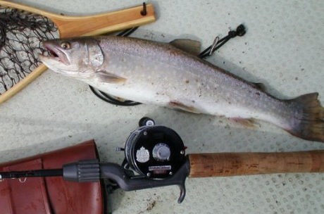 『おっ、イワナですョ!』 船べりに寄せてネットに納める。