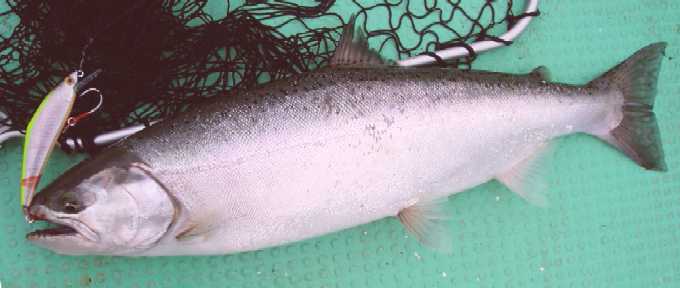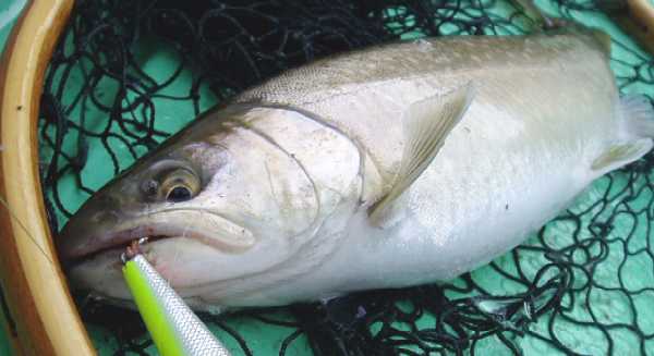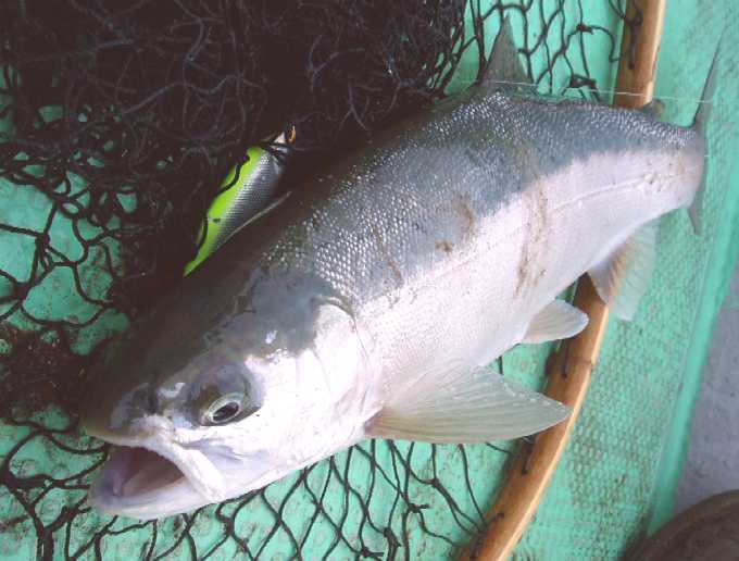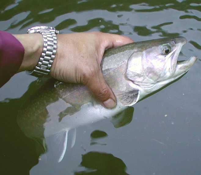 | 2007年4月21日、待望の銀山湖解禁は珍しく湧きに沸いた日となった。 この前日数日間は雪代が入ってなくて安定していたのか、北之岐でも比較的水温が高く、ワカサギの群も十分に居て期待が高まった。出船して早々に追いもあり、同行者が先陣切っての初ヒット! 『今日はイケル♪』 活性の高い解禁日、この状況を逃してはならない。 表層でワカサギを追いまわしているのは主に鉄砲玉的な30クラスの固体が多い。この状況下で水面でも活性が高いからこそ、も少し深場を狙って大物を一発当てるチャンスでもある。 岸と平行線で沖合い5m、ボトムなのだ、表層には目もくれずに底を取る。 活性は高い、居る、食う、食わせる。釣りは偶然ではなく、信念と状況が合致した時に必然と釣れる。 もしも確率論的な要素があるならば、その確率を高めるのがテクであり、ソレは決して神頼みや魚に念を送るワケでもなく、確率が高い所を見極めて確率の高い探り方をする。食うのは偶然かも知れないが、食わせる状況に自分の身を入れるのが必然的要素となってヒットを生み出す。 信念通りに深場から引き出した初物イワナは44p。 釣れればイイではなく、イワナを釣る、狙いはイワナのポイントと釣り方での結果である。 この水中にはイワナもサクラもレインボーもワカサギを狙ってウロウロしているであろう。がしかし、イワナのみにターゲットを絞った釣り方も可能なのだ。 さて、あなたはこの湖に暮らす悠々たる銀山湖の大イワナである。水温も好ましく、エサのワカサギも食べ切れない程に湧いている嬉しい日々。岸辺の浅場にはワカサギがビビッて群れて固まってるゾ。でも今あなたはどこに居る? 表層で雪景色でも眺めているか? 中層を泳いで体力作りでもしているか? 沖合いの湖底で静かに寝ているか? 30ソコソコのヤング君達は活発に岸辺に行ってワカサギを追いまわしているが、そのヤング君達を威圧しながらワカサギを独り占めしたくないか? 嫌でしょ、あの付近は恐いのだ。明るい鏡の様な水面が恐く、逃げ場の無い浅場はもっと恐い。沖合いの中層に居てもワカサギは捉え難いし、周りに何もない場所は目が回るし不安で恐い。居心地の良い場所は、湖水以外の何かが有って見えて隠れられてワカサギが通りかかってくれる場所。岸辺に近いカケアガリの湖底。岩もあるし木も沈んでいる。湖底と言う障害物が見える位置が一番の安心感なのだ。このカケアガリに身を潜めていれば、きっとワカサギの群が頭上を通り過ぎる。無理に危険を冒してまで浅場に食いに行くまでもなく、この安心出来る場所で捕食していても十分に旬のワカサギを堪能出来る。 ここで確率論的な要素が出て来ます。確かにイワナは表層にも居る事もあるし、沖合いの中層にも居るかも知れない。でもイワナはイワナであり、その個体が大きくなればなるほどに深場のボトム、または安全な障害物としてのカケアガリのベタ底に居るであろうと安易に想像が付く。大袈裟に言えば、沖目の表層を探ってイワナを狙うのと、根掛かり覚悟でカケアガリをトレースするのと、ドチラがイワナを釣るのに効果的であるかなのだ。川でも湖でも同じ、イワナは石を釣れであり、イワナは底を釣れと必然的になって来ます。周りに何も無い水中よりも、カケアガリや立ち木と言った障害物がある所が最も確率を高められるポイントになります。 今回活躍させたのはDコン85。シーズン初期だけに目立ったが勝ちカラーをチョイス。 純正の小さなトリプルフックは外し、大きなシングルをケブラーで結んでサイレント仕様。 このルアーはティールのフックをシングルにしただけでも動きがキビキビとし、大きなフックで掛かりも深くなるので効果的。 シングルはバレ易いって? そんな言い訳みたいな迷信を免罪符にしてる方は上達はしないでしょう。 バレるか否かは事後の話しで時の運だとでも言いたい。優先すべきはルアーを食わせる事であり、まずはルアーにガブリ付いてもらわない事には釣りにならないのだ。まぁ百歩譲ってシングルではトリプルよりもバレ易いとしよう。がしかし、その動き的には経験上でトリプルよりもアピール度が強く、同じルアーならばスローでも動いてくれるのは事実。もちろん根掛かりも回避し易いし、ルアーを舐めた程度のアタックならば痛みを与える事も少ないので、すぐさま追い食いも可能。釣りはバレる言い訳を考えながらではないのだ。まずは食わせる事、最優先すべきは食わせる確率を高める事でもある。仮に3匹掛けて3匹キャッチするのと、5匹掛けて4匹キャッチするのと、結果的にはどちらが多く釣ったと言えるか?。 でもシングルって、思う程にバレは少ないものなのですよ、と。 バレるのはコンピューターのシュミレーションでもなく事後の事実であり、全く同じ状況下でトリプルの時と比べるのは事実上不可能。見た目でもトリプルよりも動きが良いのは事実だし、曳き方によって動きを悪くす