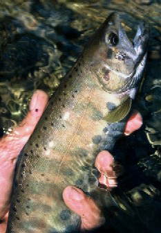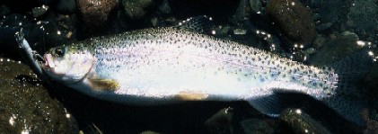 車の止め場を見つけては、チョイと釣りをする。開けた浅瀬にルアーを流す。川底はハッキリと見えるが、魚は見えない。が、ヒット!ジャンプ!Whaooo! この瀬だけでキレイなニジ3匹。