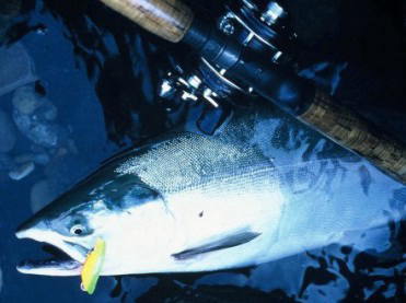 周りの釣り人が一斉に注目。(〜そりゃそうだ、海に突っ立ってるイナカモンが一人でワメイているのだから) 魚と同調してドラッグが懐かしい音を奏でる。さらに沖にツッ走る!ドラッグが高い音へと換わる。