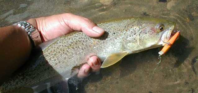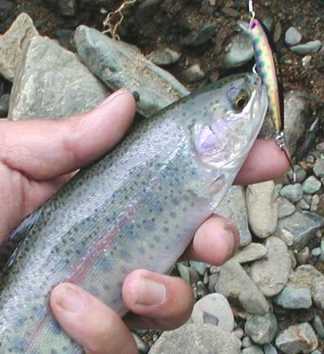 下流に下って毎度の支流との合流ポイント。水量は落ち着きつつも、多目な流れはクリアーな流れに戻っていた。 ワンキャスト目から流れの合わせ目で、小型ながらも元気溢れマクリのニジがヒット! 徐々に釣り下ると、瀬からは反応が無く、全てはプールからヒットして来る。 一撃でルアーを外すヤツ、ヒットした瞬間に身振るいしながら空に舞い上がり、バーブレスのシングルフックを吹き飛ばしてくれる。 『オレはコレが見たくてココまで来たのダァァァッ♪』 行き着く所まで釣り下り、多くを掛けてはバラシフェチの鼓動は更に勢いを増す。(笑) スバラシきかなレインボートラウト、この胸の高鳴りを聞け! 次のポイントに車を走らせ、ときめきマクル気持ちを煽るかの如くに気合を入れる。 ココでも釣りマクリの跳びマクリで大歓声を挙げる事が出来た。 まだまだストックしているポイントは続く。。。 いいのか?明朝はフェリー、まだ御土産も買いに行ってナイゾ! イイのダ、帰るのは明日の朝、今日はいつもの自由時間、常に今が全てであり、今この時間を悔いなく楽しもうではないか♪ 車に乗り込むと飲みかけのビールで一息入れ、間もなく次のポイントへ。さぁ行ってくれ!! 対岸で着水と同時に掛けた大物は、見事なるティールウォークと引き換えにルアーを吹き飛ばしてくれた。 『ツァ〜ッ、飛んだ!!! 今のを観たか!?♪』 オレの投げたルアーを咥えたヤツの華麗なる一瞬の二度とは御目にかかれない姿を! この道内のレインボートラウト、小型ながら見事にジャンプして空中でフックを外す様は、何よりも替え難い魅力を秘めている。 釣り人は魚に何を求めるのか? 大きさなのか数なのか、それとも美味しさなのか? 偶然性に頼る長さなどを自慢してるヤツはアホだ。プロもアマも同じ土俵で語り合えるのならば、決して魚を自慢するではナク、その魚を釣った自分の喜びを自慢したい。 例え大物を足元でバラシても、その出来事は熱く深く胸に刻まれる事であろう。 魚にデジタリックなタグを付けて金庫に仕舞うよりも、その時のアナロギックな感動を一晩中でも語り明かそうではないか♪