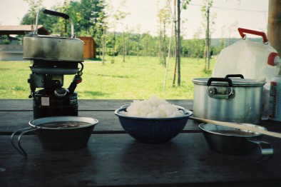 AM8:00,ご飯・トン汁・のり・コーヒー。キャンプ場内のゴミ拾いをしてから11:30移動。
