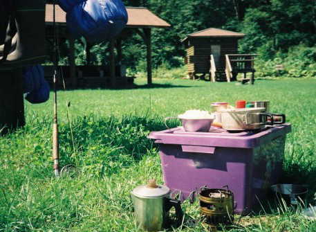 車の中から必殺ホンコンヤキソバを見つけた。よしよし、決まり。愛用のナイフのオピネルNo6は、いつの間にか黒っぽく変色しているが、砥ぎをかけているので切れ味はバツグン。この切れ味を生かして、左手に持った玉ネギを薄く細かくスライスして、同様のサラミの薄切りと生味噌トン汁の素が入ったシェラカップに落としていく。スベアで沸かしたてのお湯を注ぎ込むと、毎日のサラミトン汁の出来上がり。七味を振って 『いただきま〜す。』