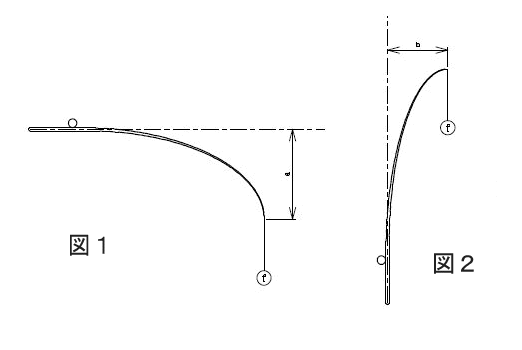 | この章が一番の本番なので心して読んで頂きたい。ベイトキャストとは言わず、スピニングキャストでも理屈的には同じですので、これを読んで実践すると即結果がわかるでしょう。 まずはバックラッシュをさせる前に(笑)、下記の図1・図2を見てください。 これは同じロッドに、方向の違う同じ負荷を掛けた図です。 図1はロッドを水平にして直角に負荷fを吊り下げたのも。 図2はロッドを垂直に立てて平行に負荷fを吊り下げたもの。 同じ負荷fでも、ロッドのどの方向に作用するかでたわみ量aとbにこんなにも差が出るのです。 このたわみ量aとbが何を表わすか、実はこれが初速の差となって表れます。 実際にキャストする時に発生する負荷fは、ルアー重量とその慣性力、それと空気抵抗。 この図は固定しているロッドに錘を吊り下げた絵なのだが、あなたが自分のロッドで実験しても同じ様な絵になりますので御安心を。 この絵は固定ロッドに固定負荷を与えているのでこれ以上は動きません。 しかし実際のキャストではロッドを振る事に依ってルアーの慣性力でロッドが曲がり、ロッドの復元力でロッドは真っ直ぐになろうと運動します。この時のロッドティップの速度こそ、図1よりも図2の方が速くなければ計算が成り立たなくなってしまいます。そうなのです、同じロッドに同じ負荷を与えても、ロッドに対しての負荷の作用方向に依って図2のロッドティップの速度の方が速くなってしまうのです。 |