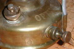 実は、ガソリンストーブには真似の出来ない、超微調整の火力調整が可能なのだ。 ←右下のツマミが加圧ポンプ ←左上のタンクキャップの小さなツマミがエア抜きバルブ 出力系はこの2点だけで制御されている。 単なるネジと、Oリングが入ってるだけのポンプのみ。 火力調整バルブが見当たらないって? この灯油ストーブには、そんな複雑なモノは着いておりません。 では、この究極のアクションとは.....?